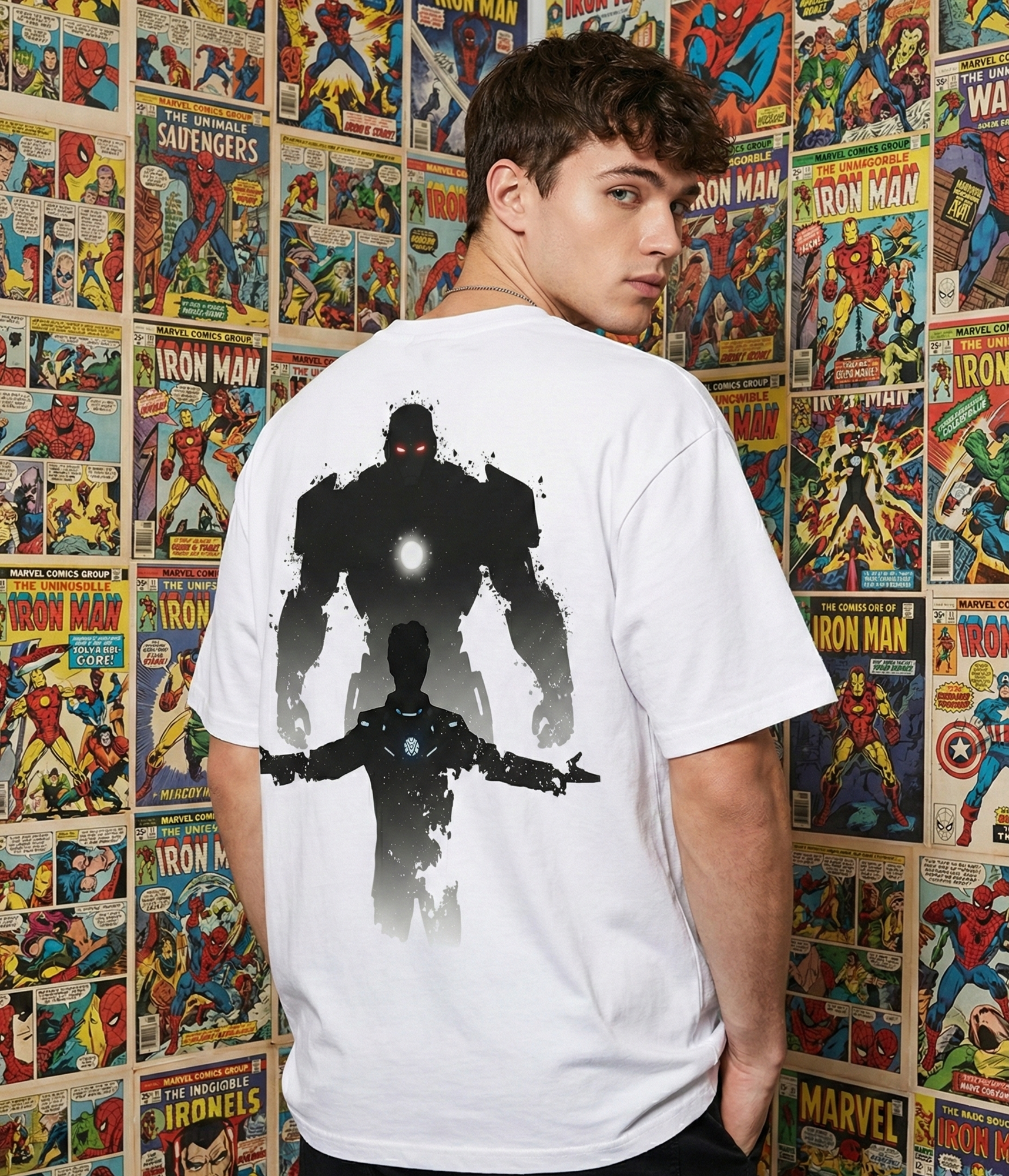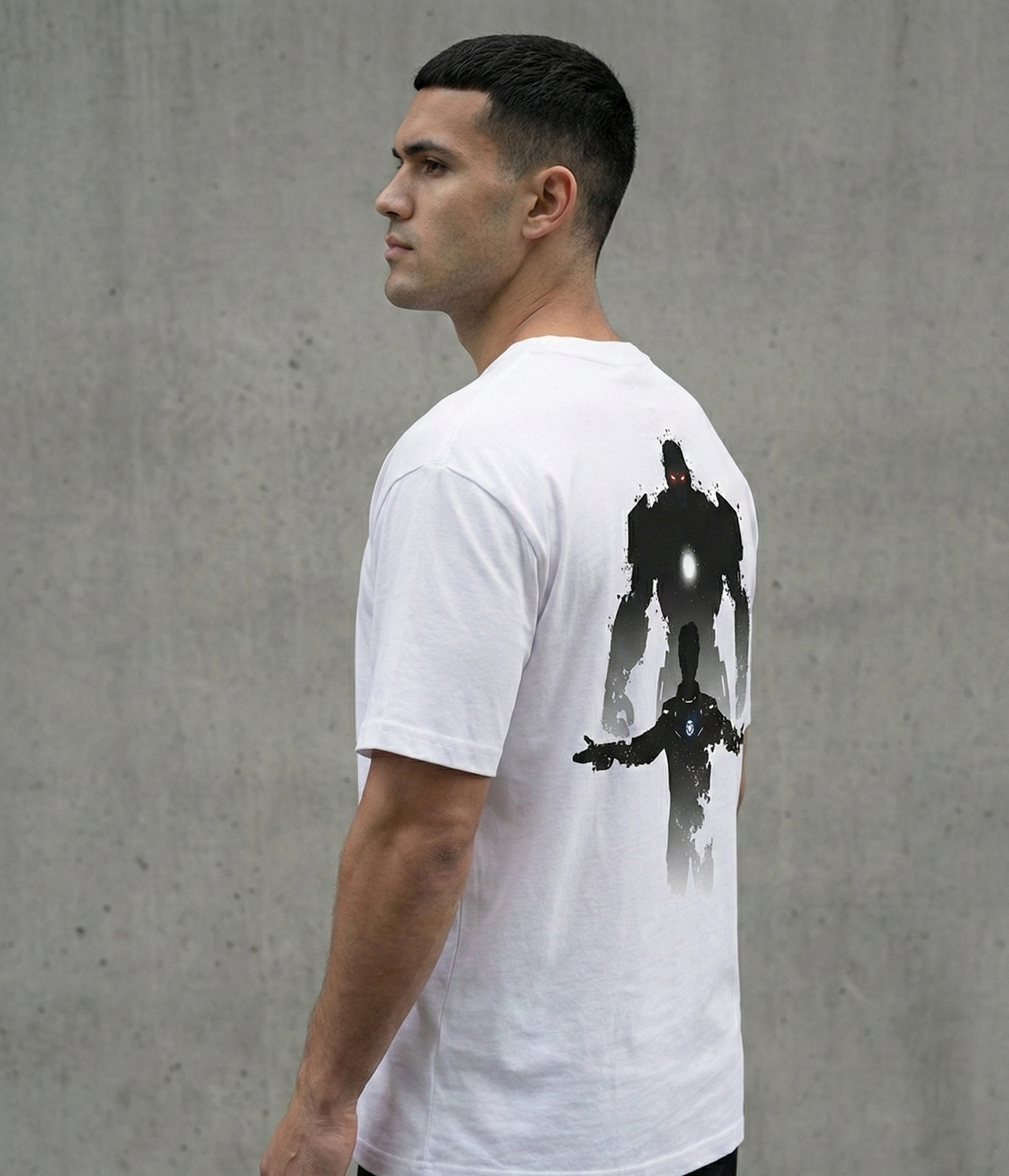 Design: Arc Reactor — inspired by duality and power. The front features a minimal tech-core emblem, while the back showcases a striking contrast graphic silhouette of a figure and armored form — symbolizing strength and legacy. A clean yet bold statement piece for fans of futuristic streetwear.