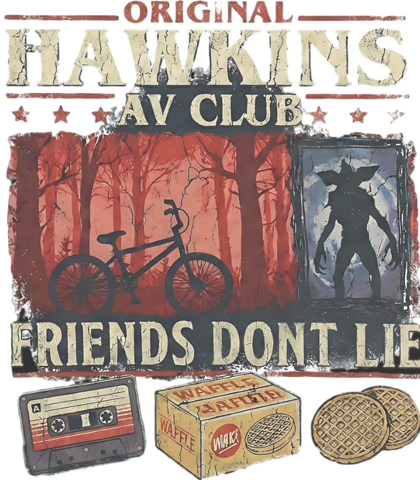 Design: Hawkins AV Club – Friends Don’t Lie — inspired by nostalgic 80s adventure aesthetics, this sweatshirt captures the essence of friendship and mystery. Featuring a distressed graphic print of the Hawkins woods, silhouettes, and iconic retro motifs like cassette tapes and waffles, it’s a tribute to the world of small-town secrets and supernatural bonds.