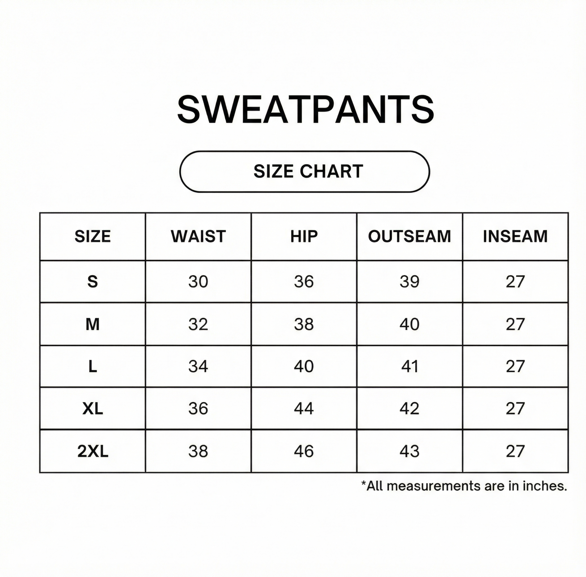 Sizing: Garment measurement in inches.