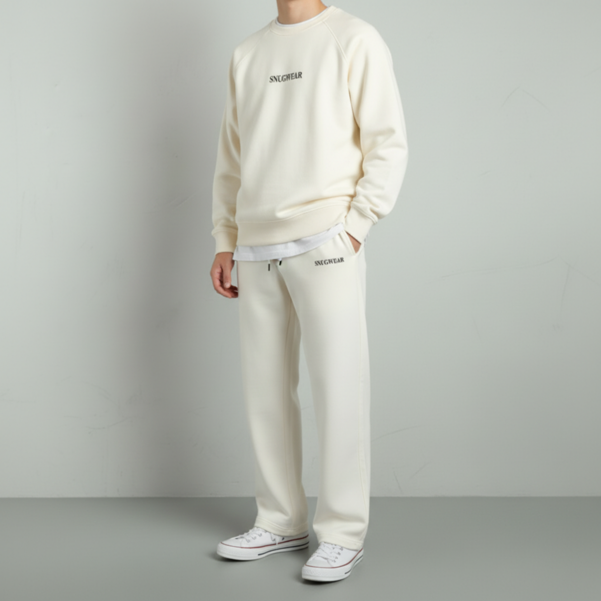 Design: Minimalist and functional — featuring a subtle SNUGWEAR logo on the upper thigh, adjustable drawstring waistband, and two spacious front pockets. The inner loop texture ensures a cozy feel, making these sweatpants ideal for all-day wear.