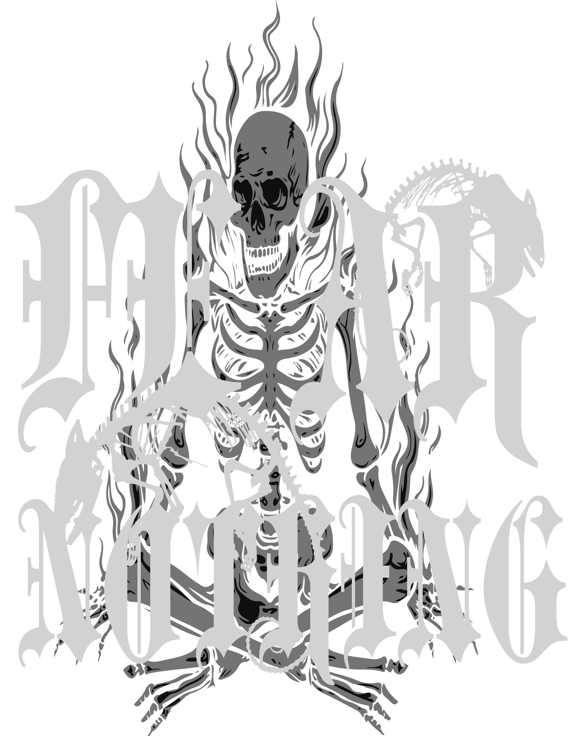 Design: “Fear Nothing” statement graphic with gothic-inspired typography and skeletal detailing across a vintage-washed black base. Each tee is uniquely washed, giving every piece its own texture and tone.