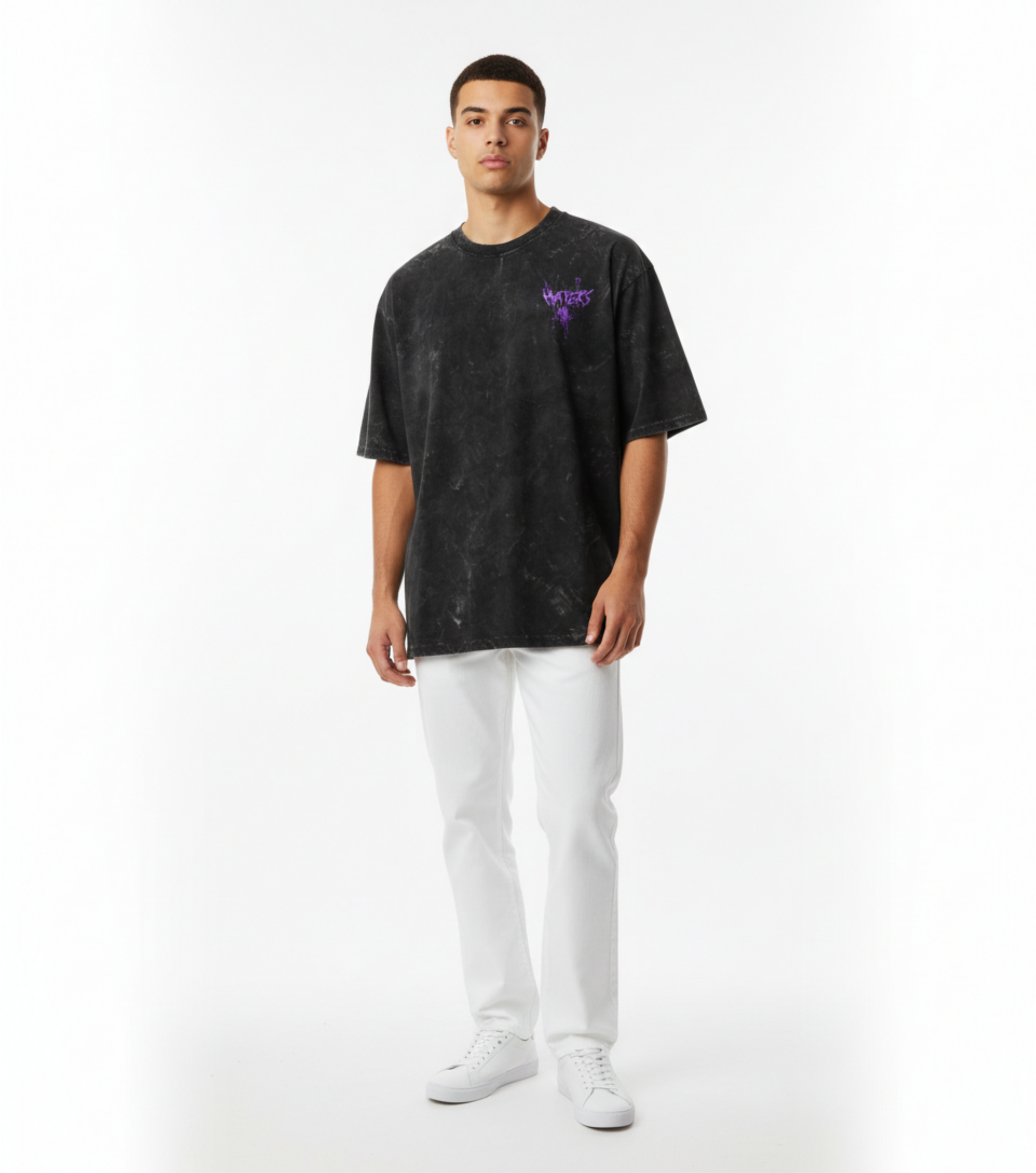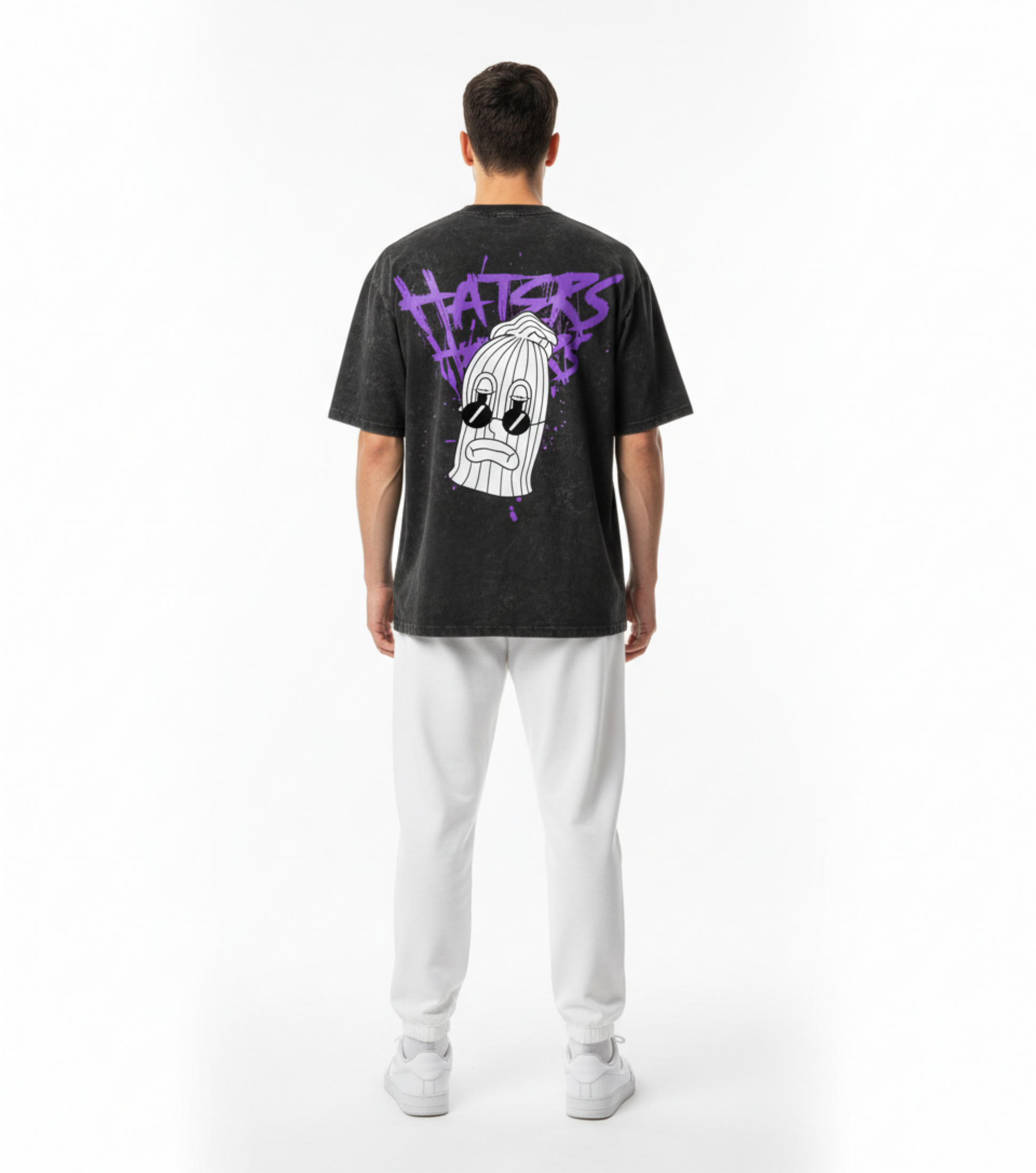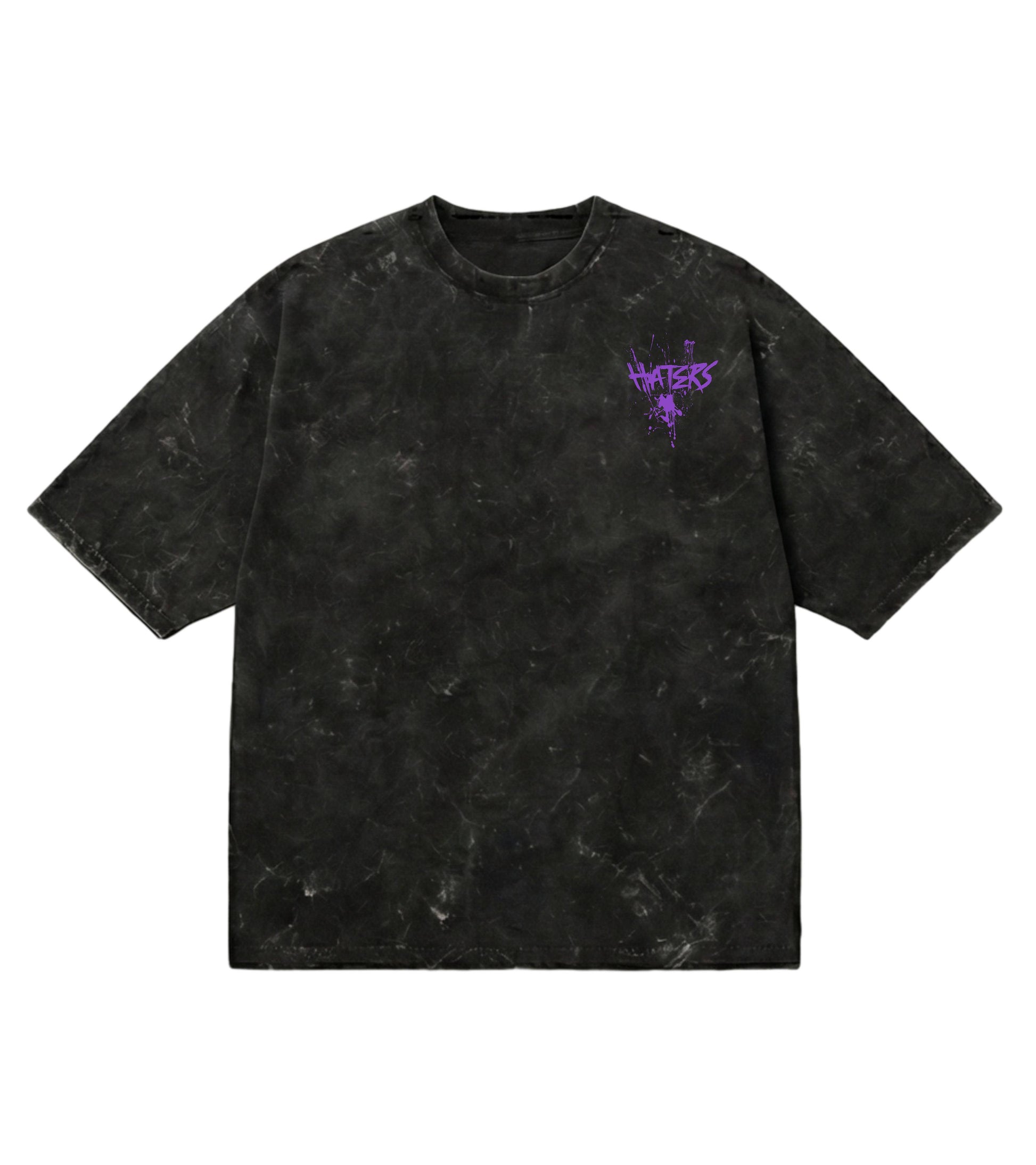 Design: Statement “HATERS” graffiti-inspired back print in purple with a stylized character graphic that brings urban attitude and humor. Each tee has a unique acid wash pattern, giving every piece a one-of-a-kind look.