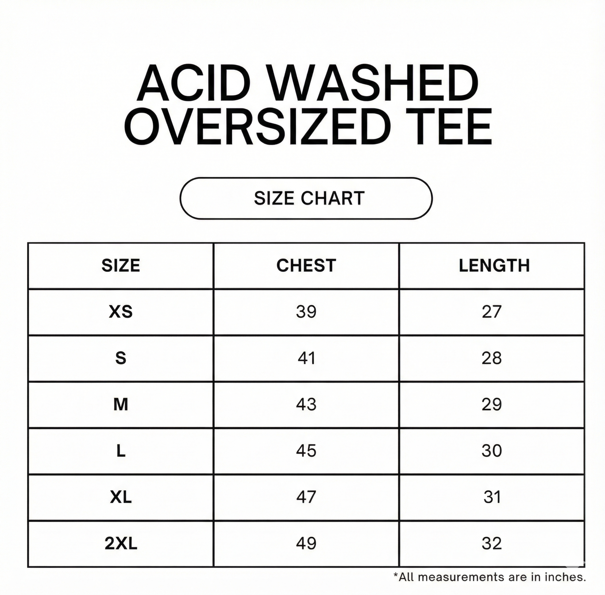 Sizing: Garment measurement in inches.
