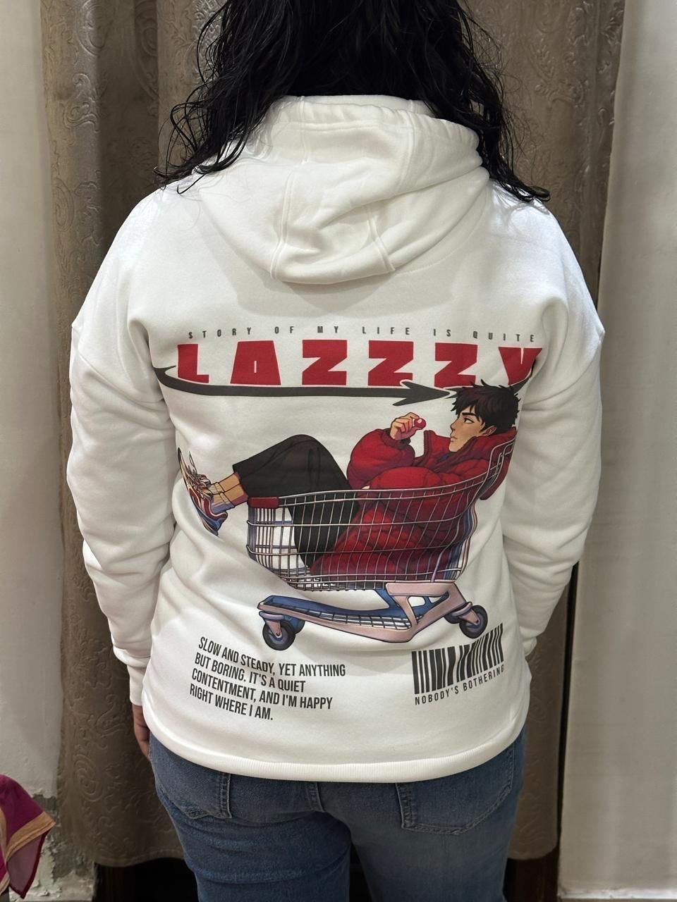 Made from premium 400 GSM cotton, this hoodie provides a warm yet breathable feel, keeping you cozy without any heaviness. The unisex oversized fit delivers a relaxed drape with dropped shoulders for ultimate comfort and effortless street-style appeal. The back features a playful anime-inspired graphic of a laid-back character chilling in a shopping cart paired with the bold “LAZZZY” text—making it the perfect hoodie for those who embrace slow days, easy moods, and carefree vibes.