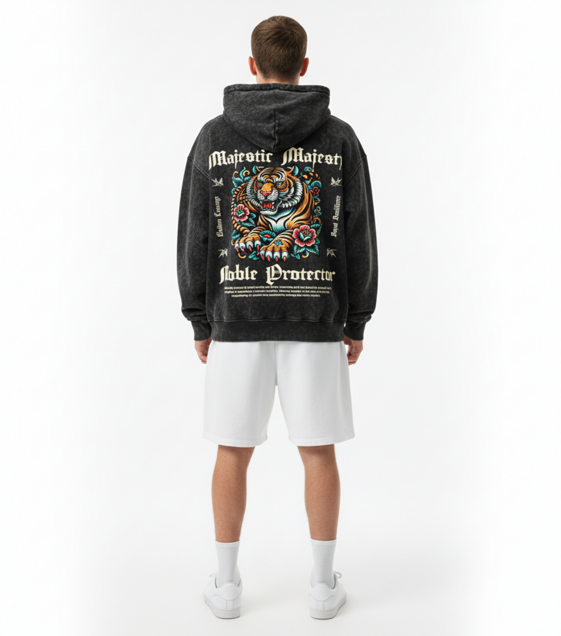 Design: Bold “Majestic Protector” tiger artwork paired with a premium acid wash texture – each hoodie has subtle variations for a one-of-a-kind vintage aesthetic.
