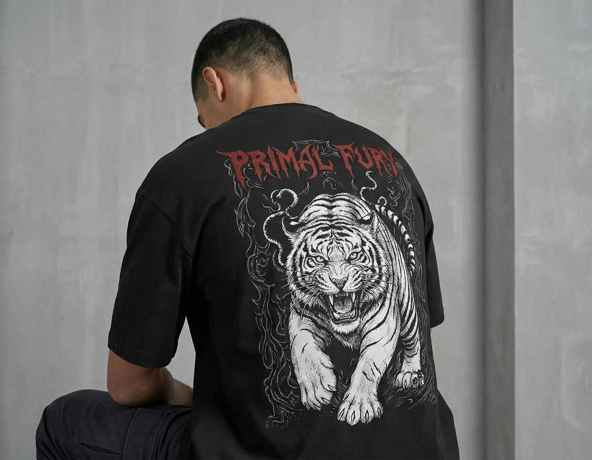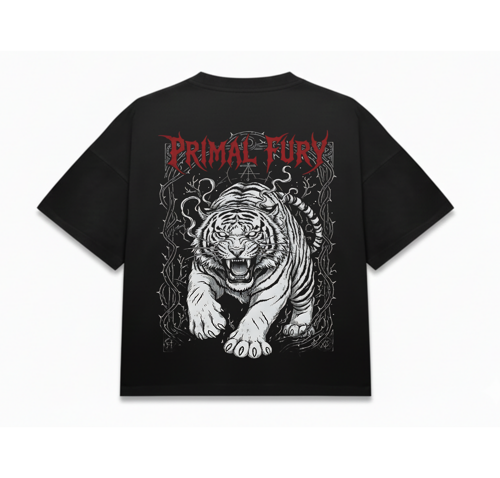 Design: Primal Fury — showcasing a powerful roaring tiger in striking monochrome tones with gothic red lettering, symbolizing strength and ferocity. The detailed illustration and bold typography make this tee a standout piece that commands attention while maintaining a sleek, minimal streetwear edge.