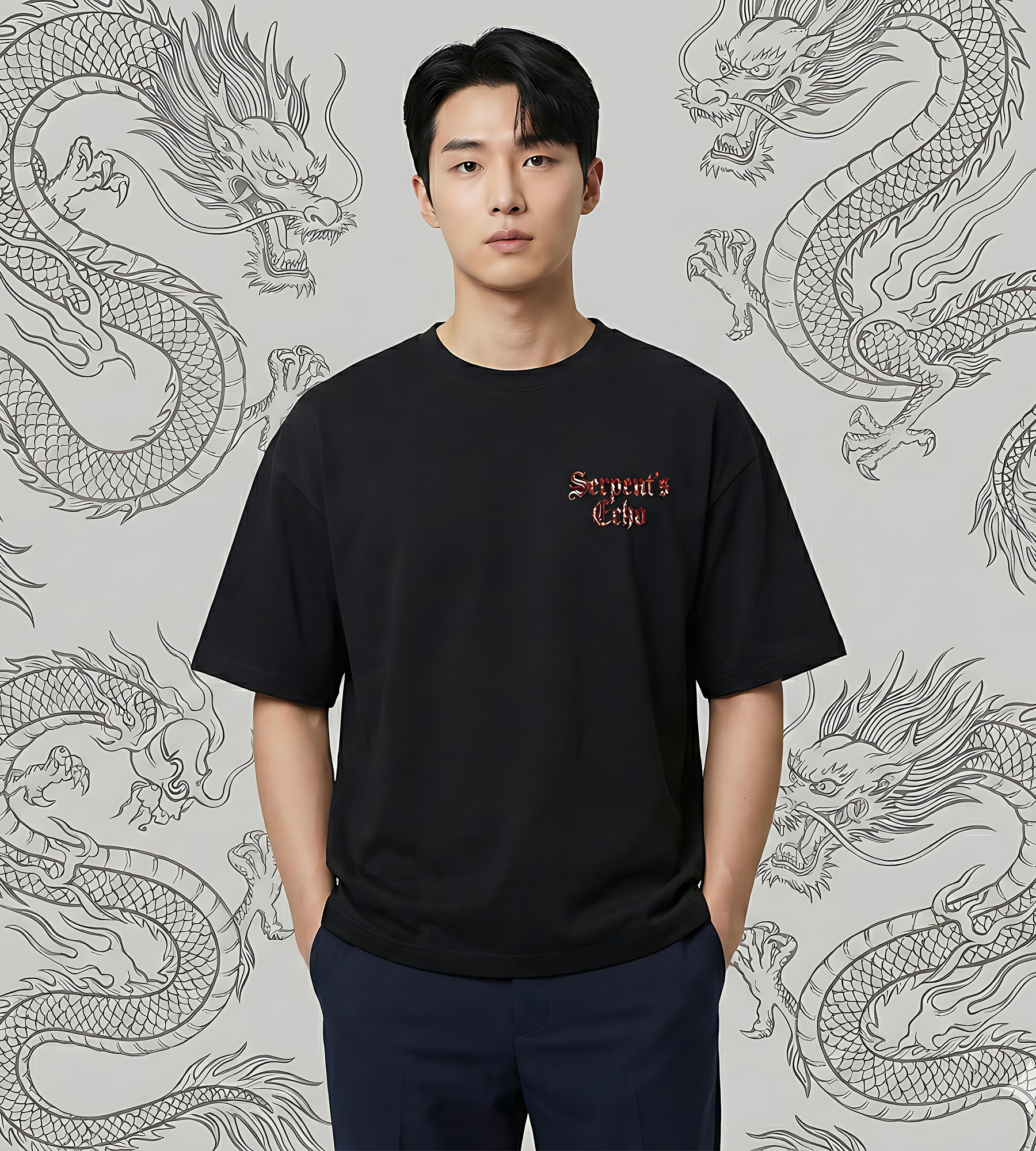 Design: Serpent’s Echo — a statement piece that fuses traditional art with bold streetwear. The back showcases an intricately detailed red dragon intertwined with blooming florals, while the front features subtle gothic text embroidery. A perfect balance of fierce energy and refined detail.