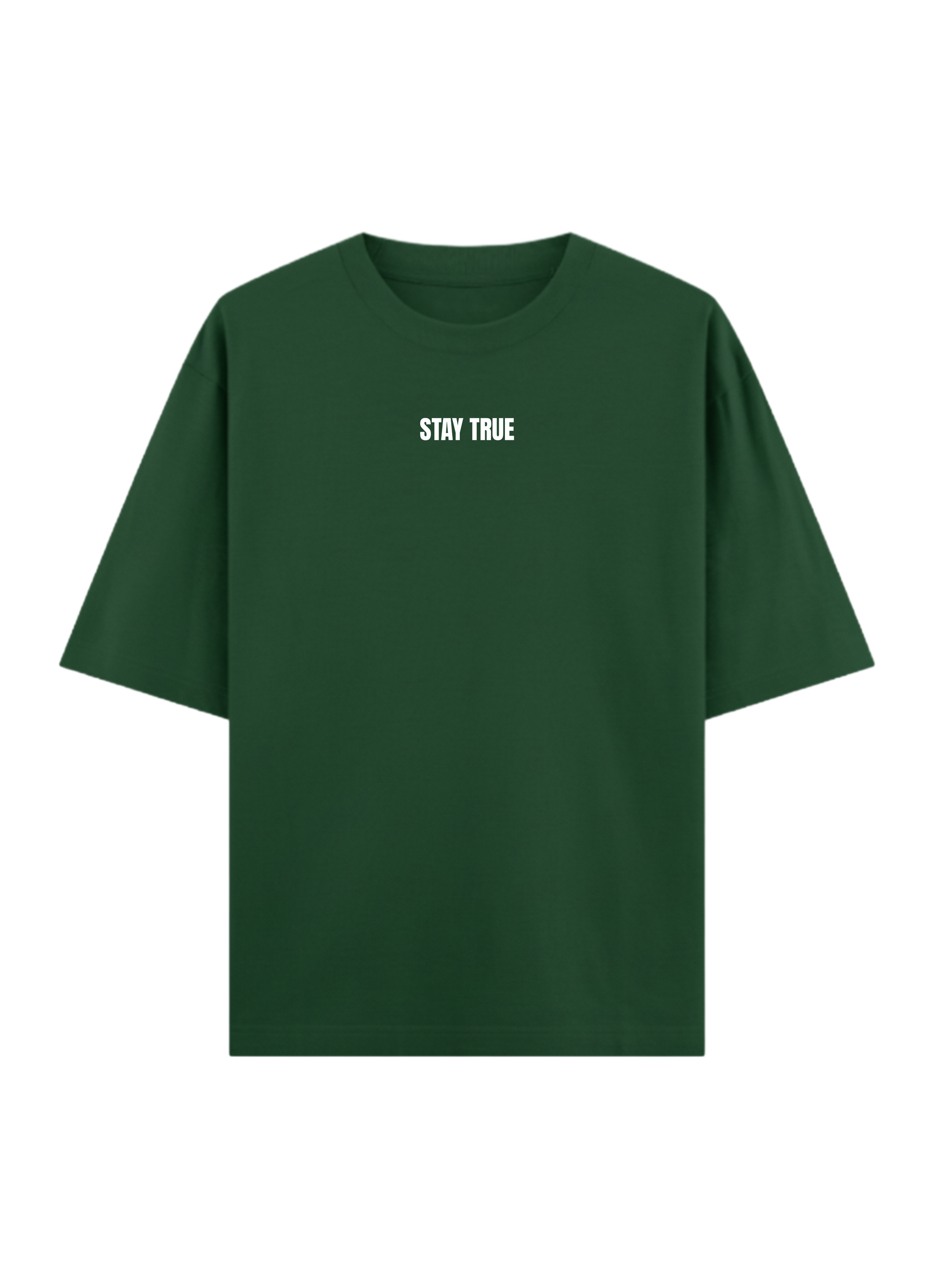 Design: Stay True — clean, minimalist, and bold. The crisp white text on deep forest green delivers a simple message of authenticity and individuality. Perfect for those who value understated confidence in their streetwear rotation.