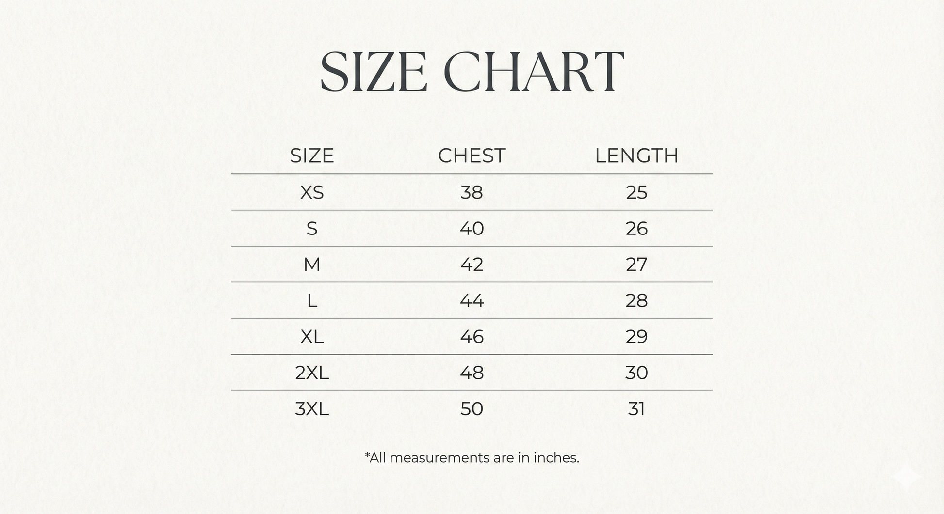 Sizing: Garment measurement in inches.
